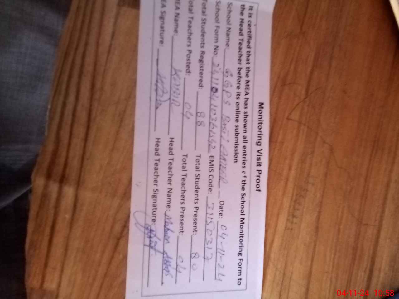 | Attendance Register | Head Teacher | MEA with School | Visit Proof |