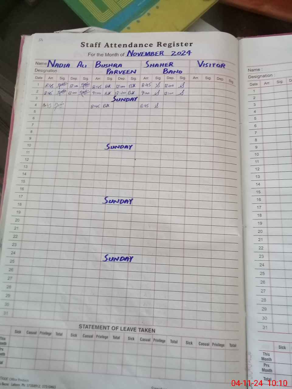 | Leave | Duty | Absent | Maternity | Medical | Ex- Pak |