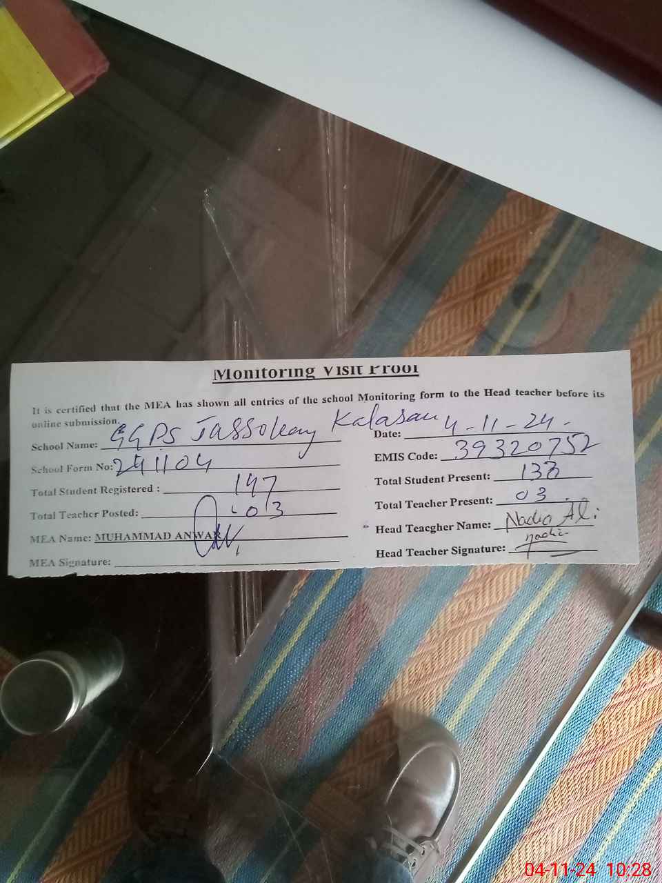 | Attendance Register | Head Teacher | MEA with School | Visit Proof |