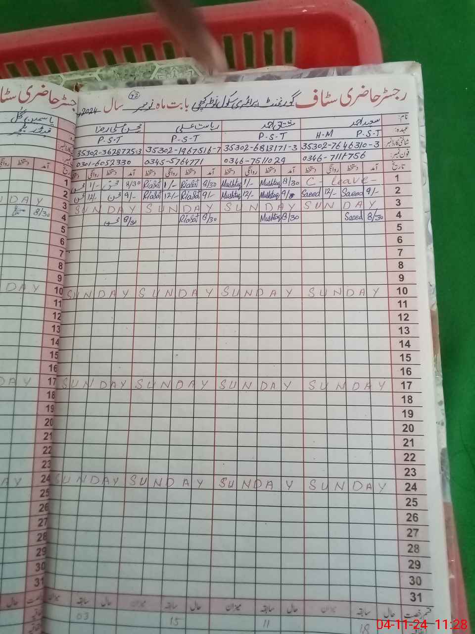 | CNIC | Full Name | Designation | R/C | Absence During Last Calender Month |