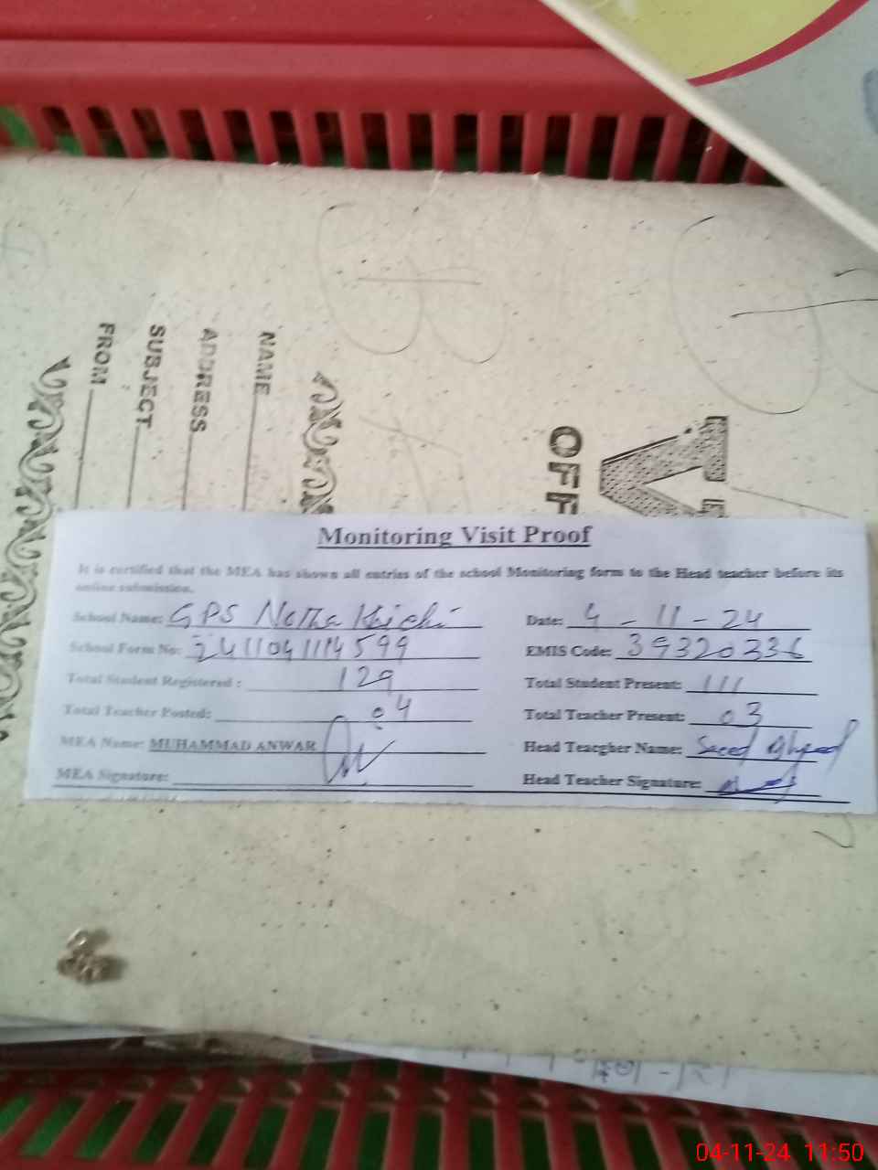 | Attendance Register | Head Teacher | MEA with School | Visit Proof |