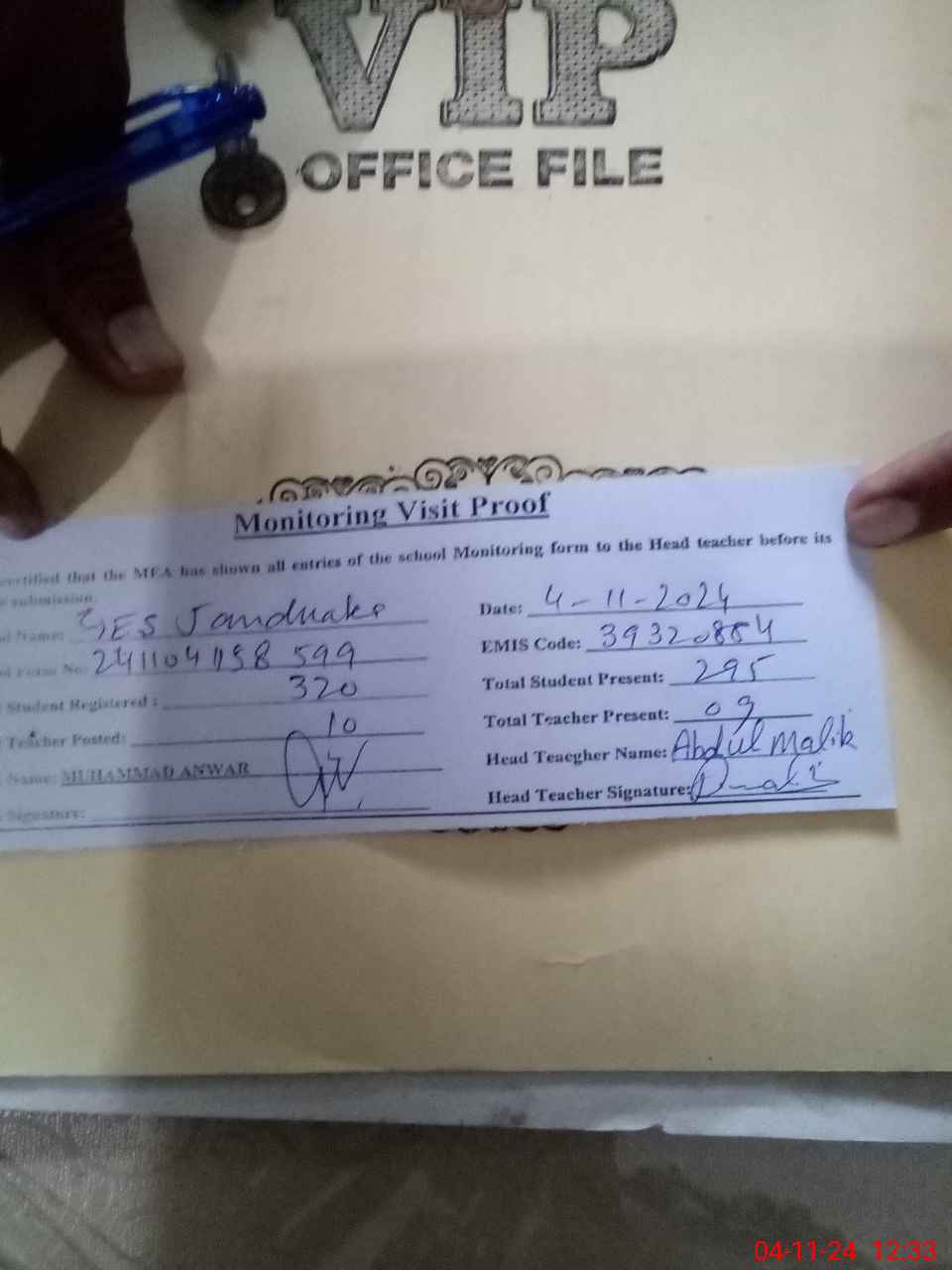 | Attendance Register | Head Teacher | MEA with School | Visit Proof |