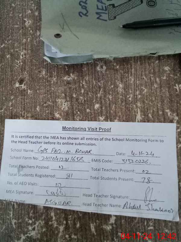 | EMIS Code: 31320226 | Name of School: GPS BASTI FAIZ AHMAD BOHAR | |||