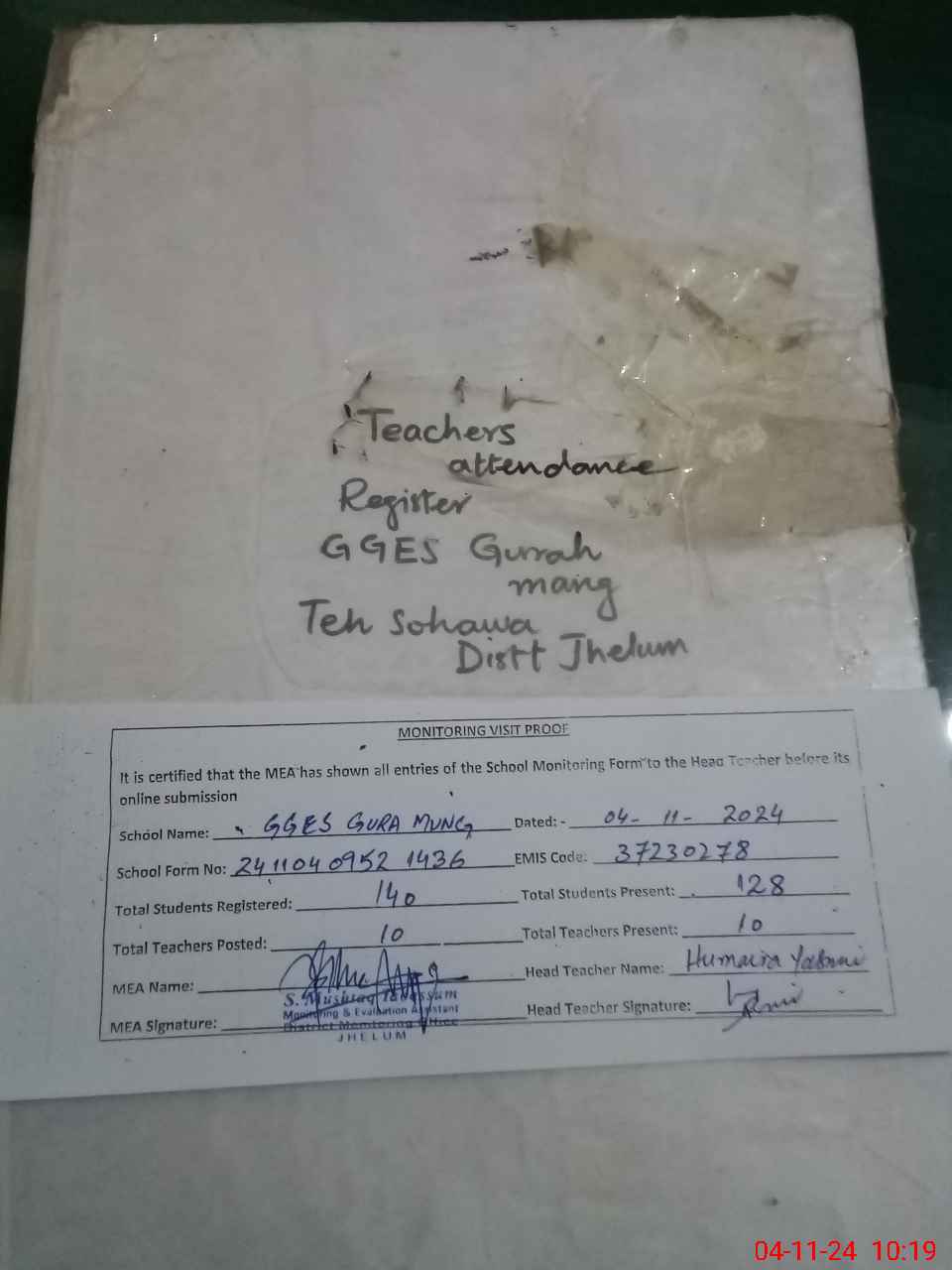 | Attendance Register | Head Teacher | MEA with School | Visit Proof |