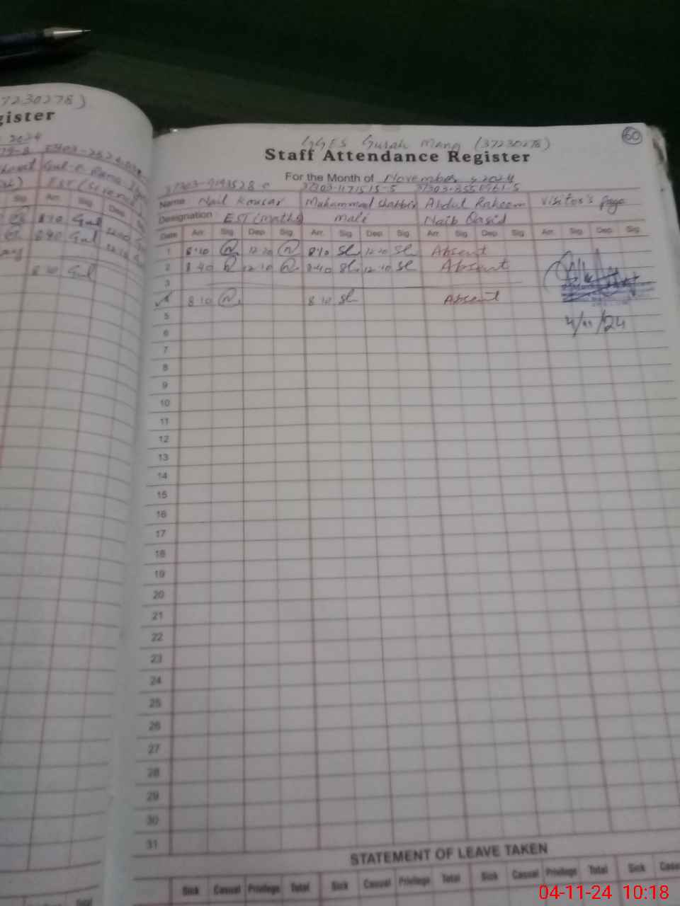 | 37**** | Ab**** Ra**** | NAIB QASID | 0 | 0 | 31 | 0 | 0 | 0 | 0 | 0 | 0 | Absent (Un-Authorized) | |