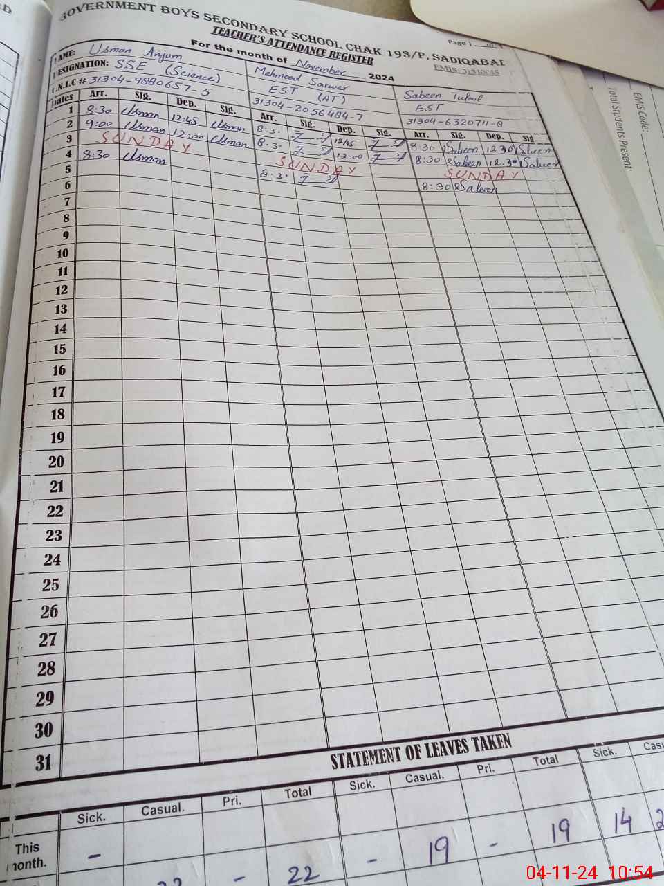 | CNIC | Full Name | Designation | R/C | Absence During Last Calender Month |