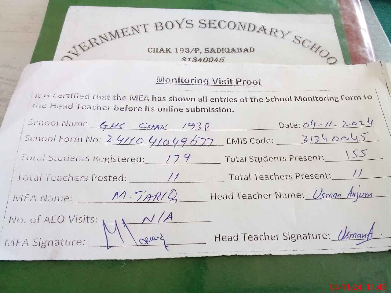 | Attendance Register | Head Teacher | MEA with School | Visit Proof |