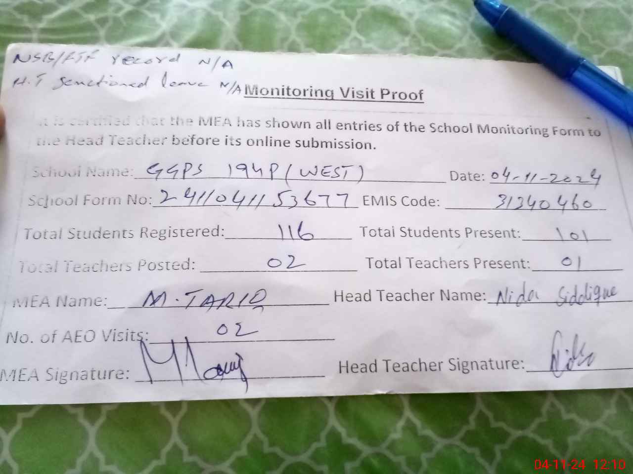 | EMIS Code: 31340460 | Name of School: GGPS CHAK NO. 194/P WEST | |||
