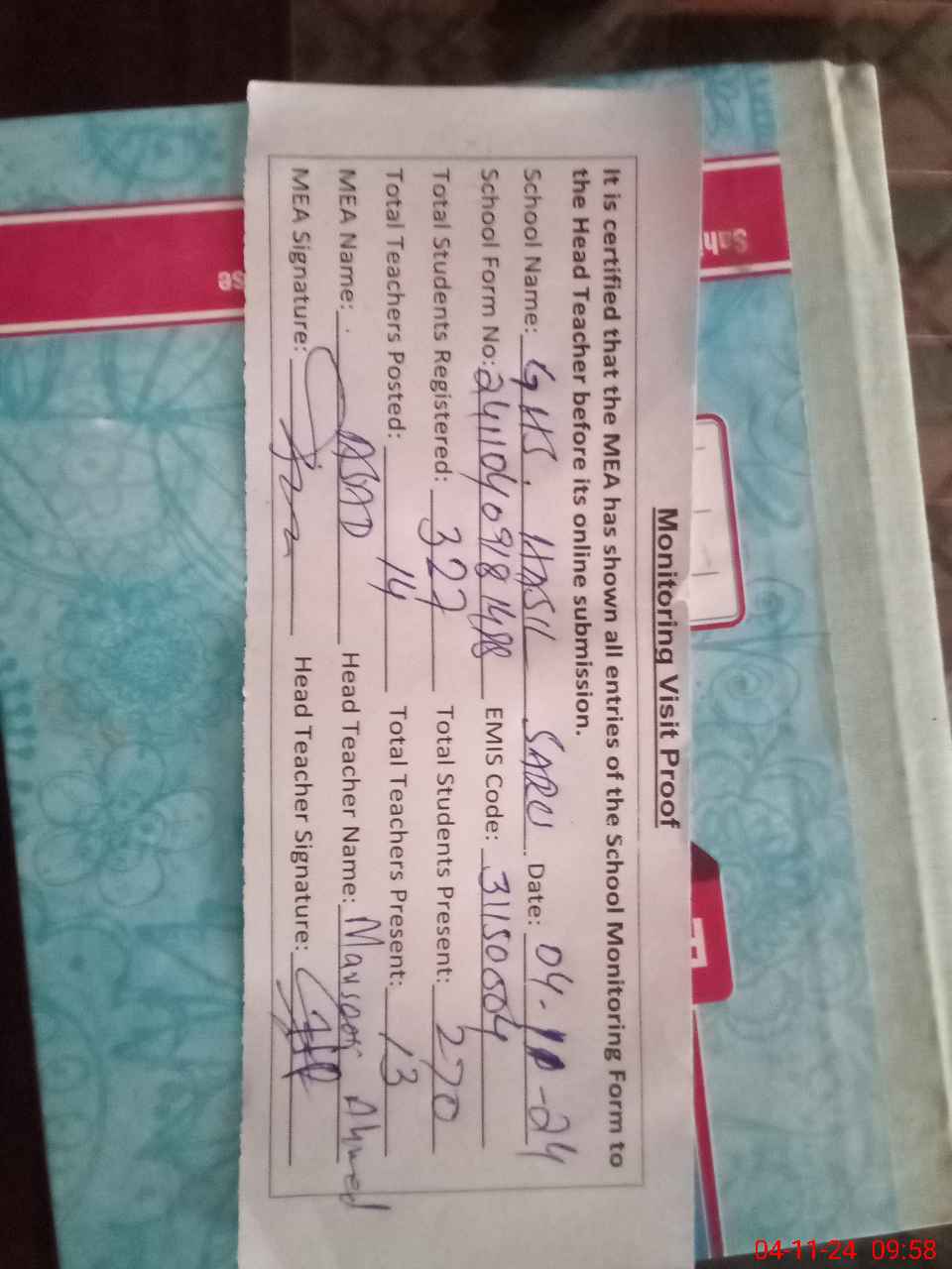 | Attendance Register | Head Teacher | MEA with School | Visit Proof |