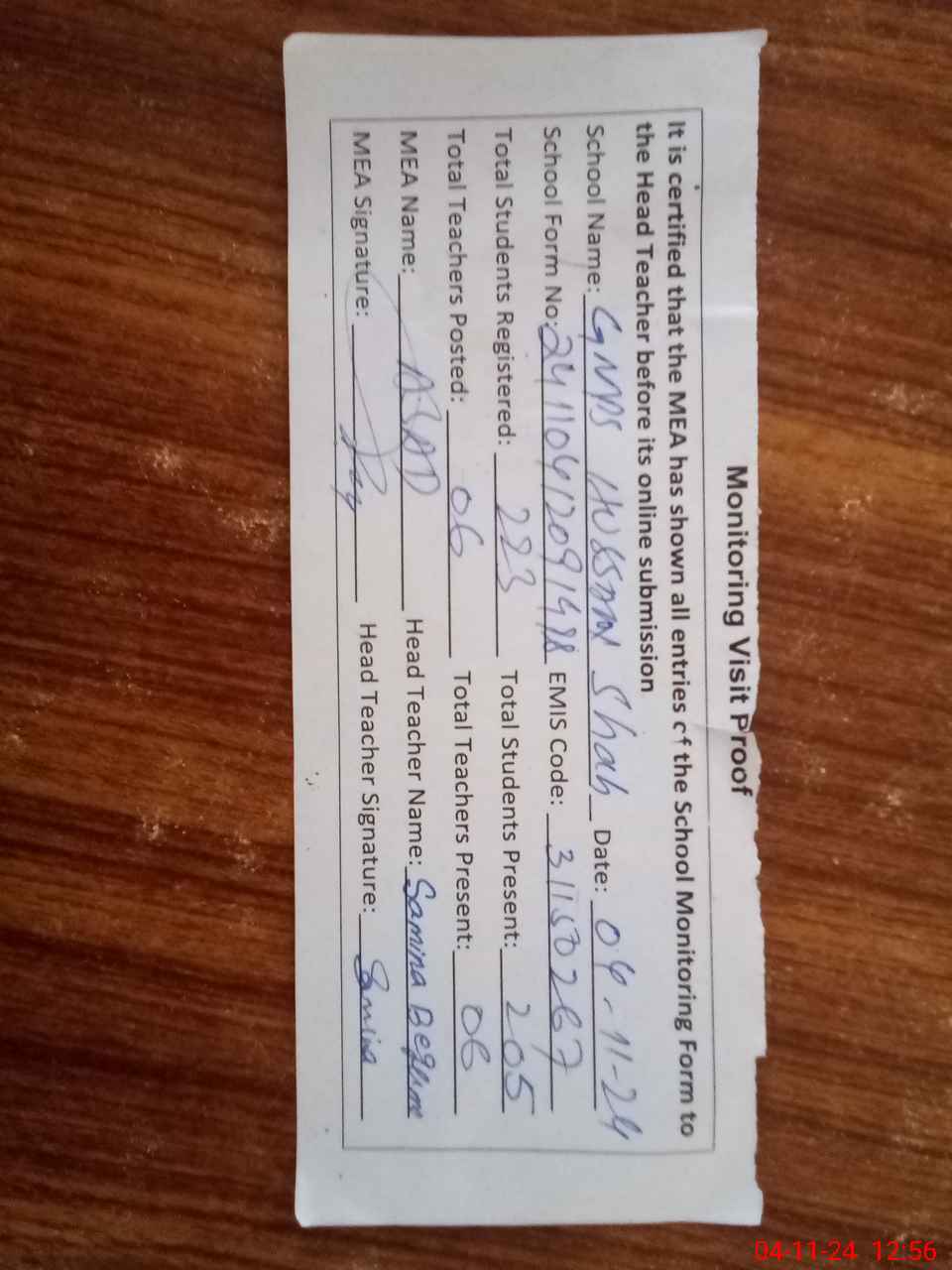 | Attendance Register | Head Teacher | MEA with School | Visit Proof |