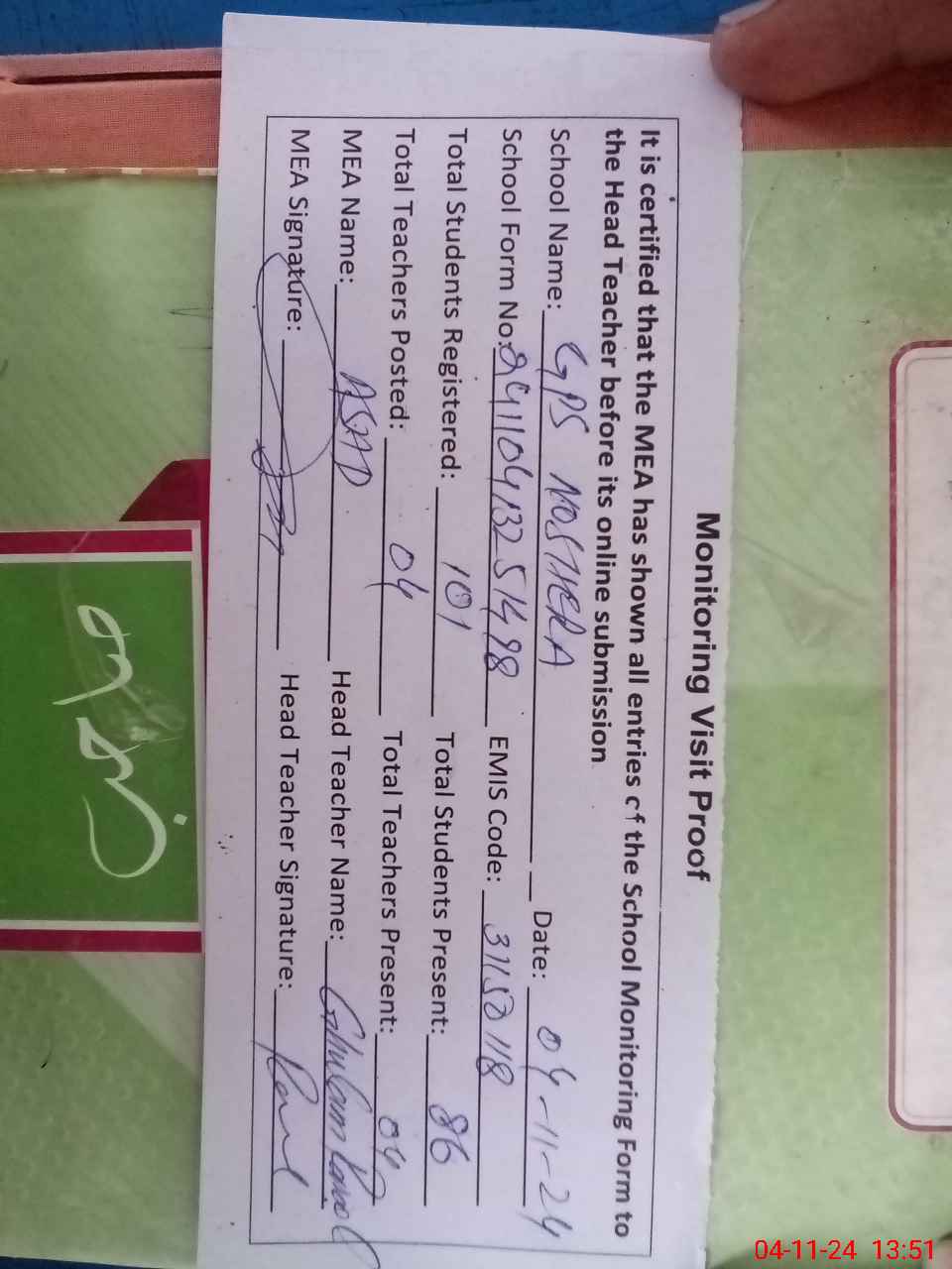 | Attendance Register | Head Teacher | MEA with School | Visit Proof |