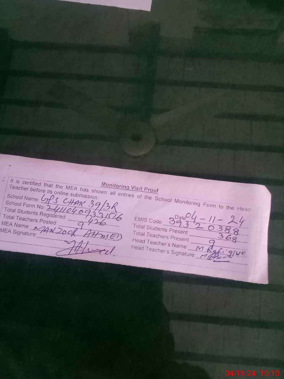 | Attendance Register | Head Teacher | MEA with School | Visit Proof |