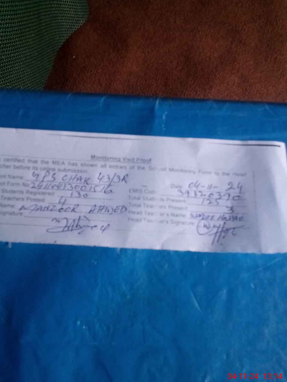 | Attendance Register | Head Teacher | MEA with School | Visit Proof |
