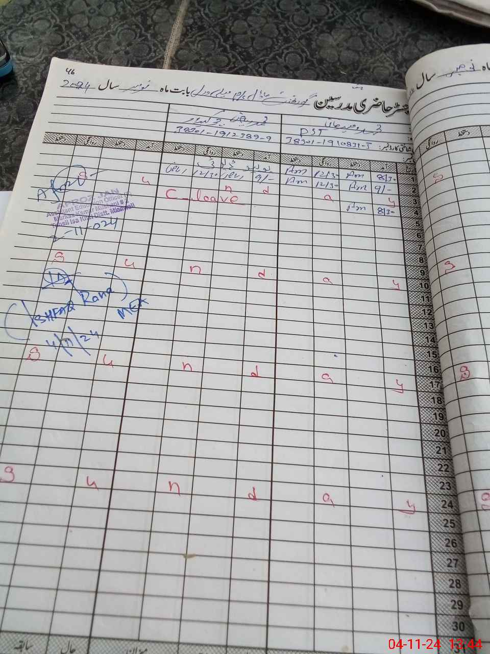 | CNIC | Full Name | Designation | R/C | Absence During Last Calender Month |
