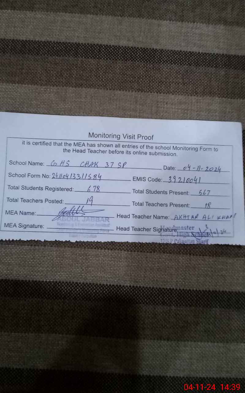 | EMIS Code: 39210041 | Name of School: GHS CHAK 37 SP | |||
