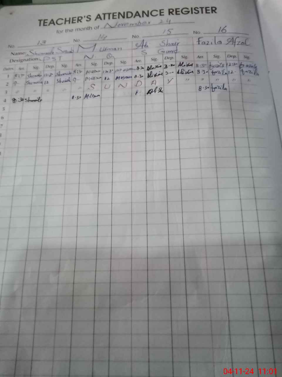 | CNIC | Full Name | Designation | R/C | Absence During Last Calender Month |