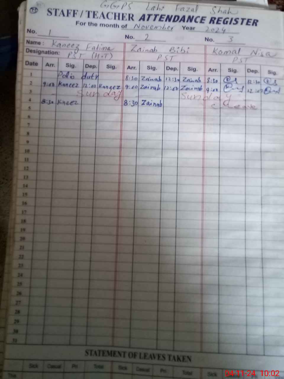 | Leave | Duty | Absent | Maternity | Medical | Ex- Pak |
