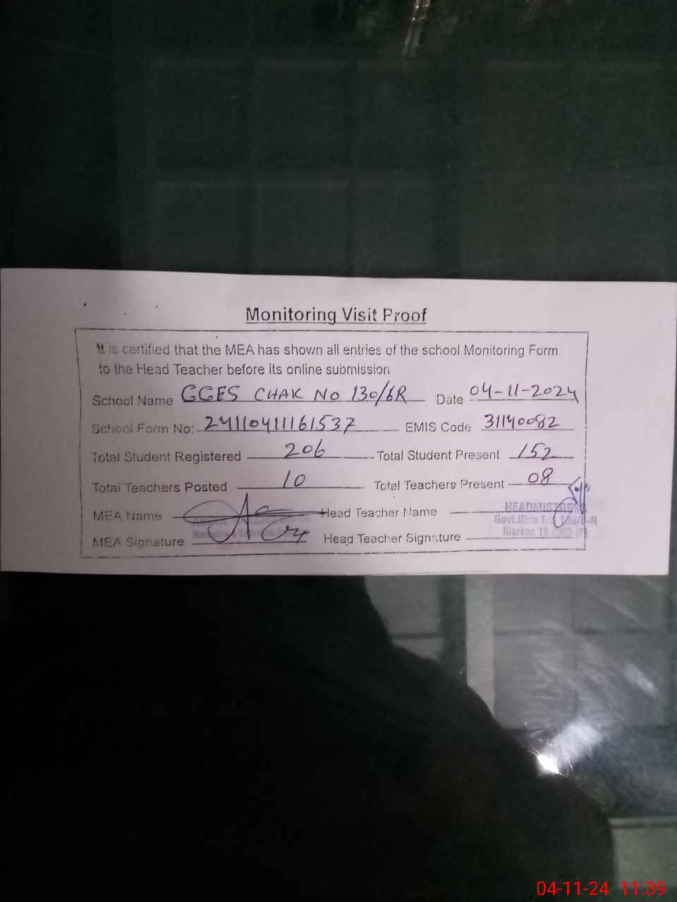 | Attendance Register | Head Teacher | MEA with School | Visit Proof |