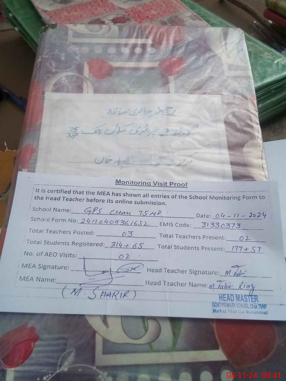 | Attendance Register | Head Teacher | MEA with School | Visit Proof |
