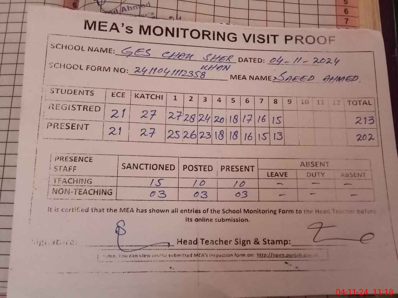 | Attendance Register | Head Teacher | MEA with School | Visit Proof |