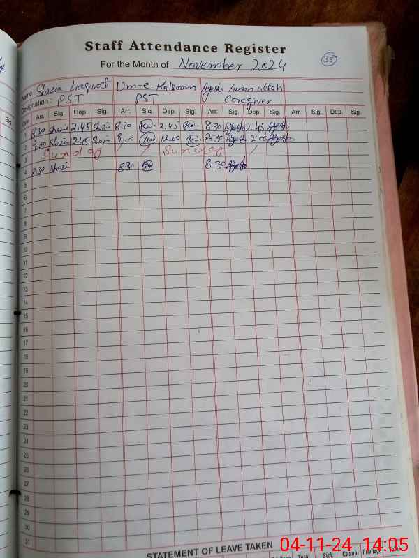 | CNIC | Full Name | Designation | R/C | Absence During Last Calender Month |