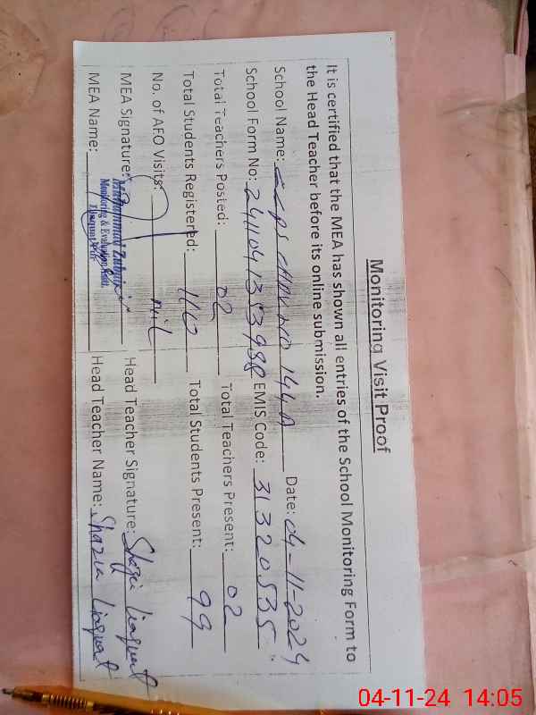 | Attendance Register | Head Teacher | MEA with School | Visit Proof |
