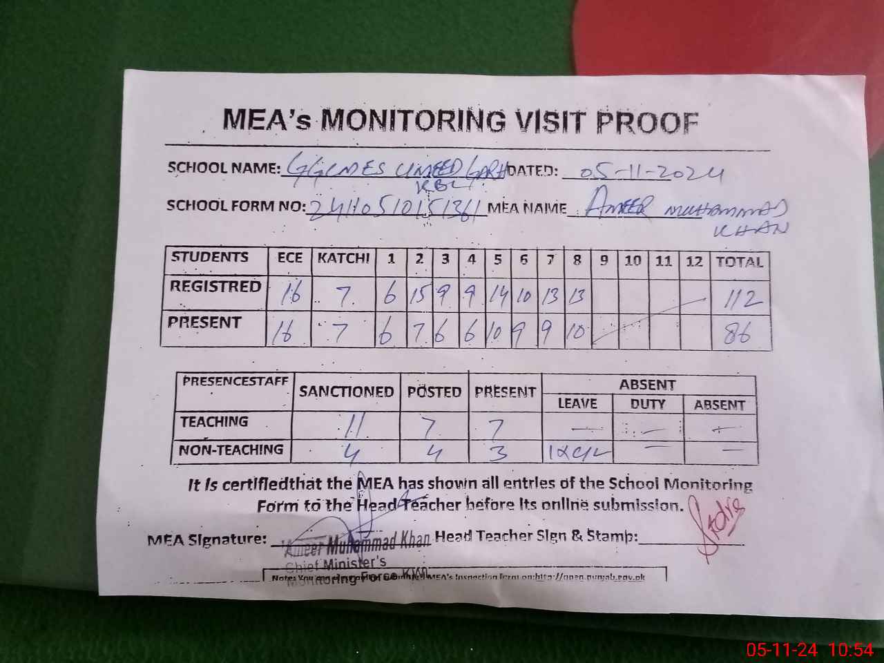 | Attendance Register | Head Teacher | MEA with School | Visit Proof |