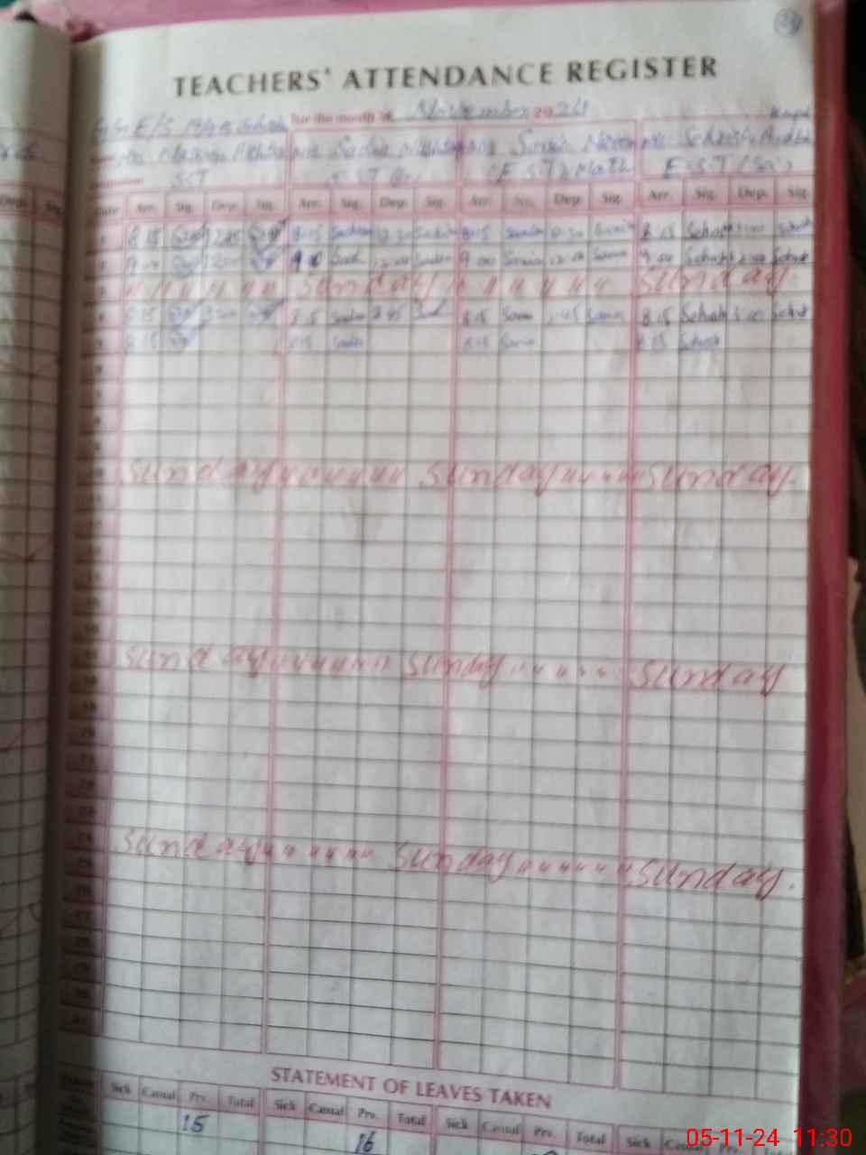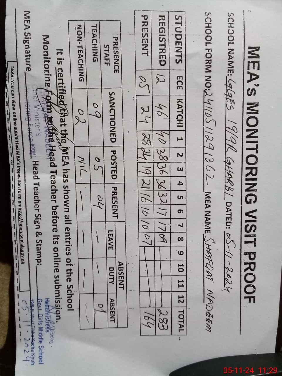 | Remarks (Use Separate Page if Required): 03 toilets are nonfunctional savrag lines blocked Cleanliness of toilets are very poor 01 teacher named pst Musarat Atta showing on leave but leave not approved on line | |||||