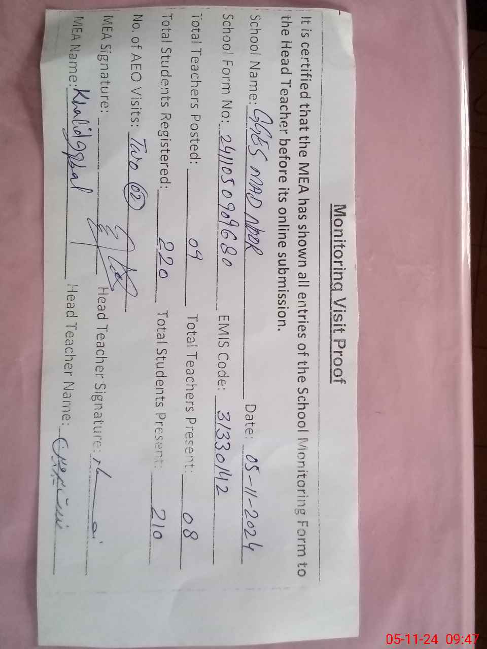 | Attendance Register | Head Teacher | MEA with School | Visit Proof |