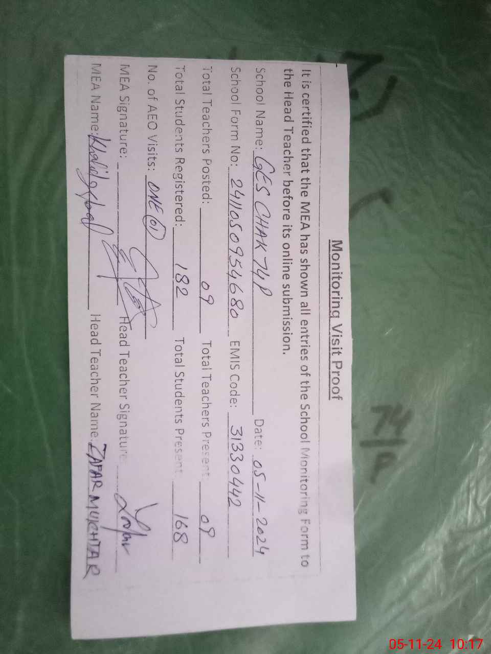 | Attendance Register | Head Teacher | MEA with School | Visit Proof |