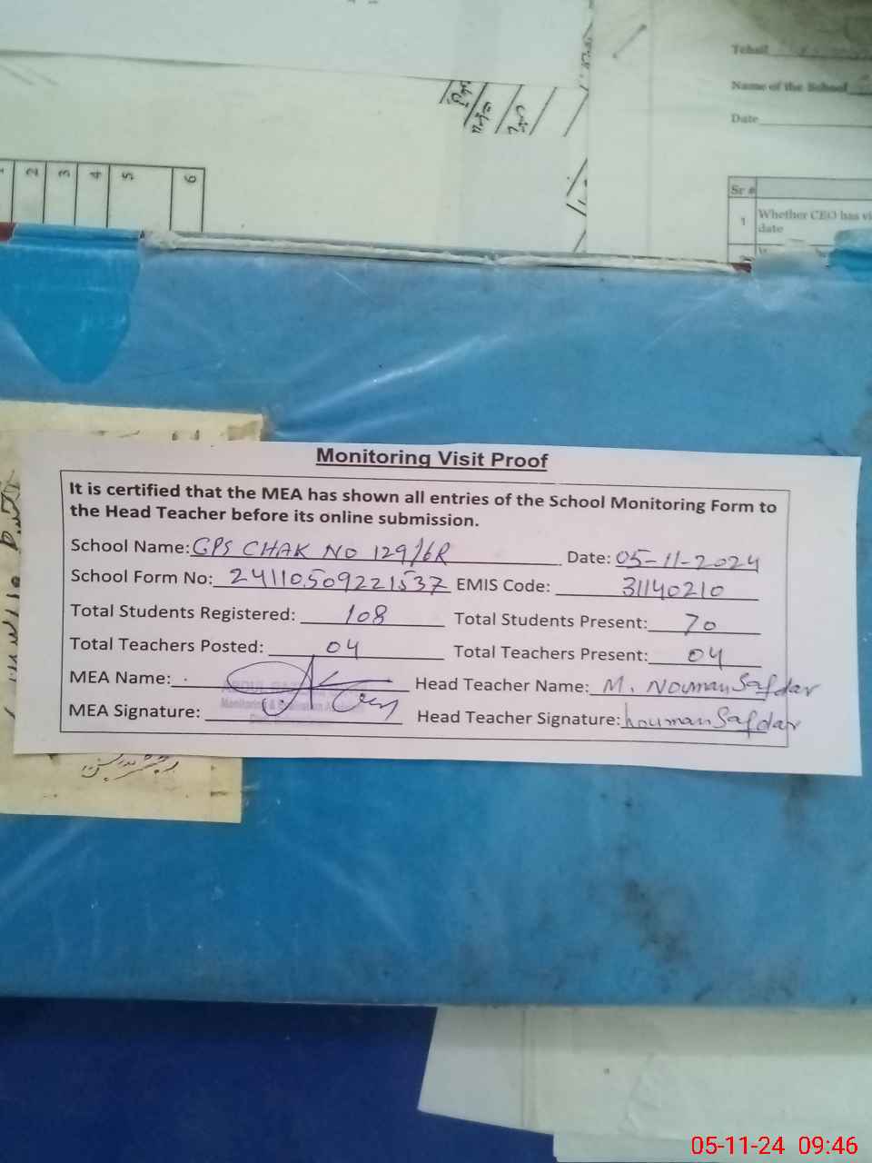 | Attendance Register | Head Teacher | MEA with School | Visit Proof |