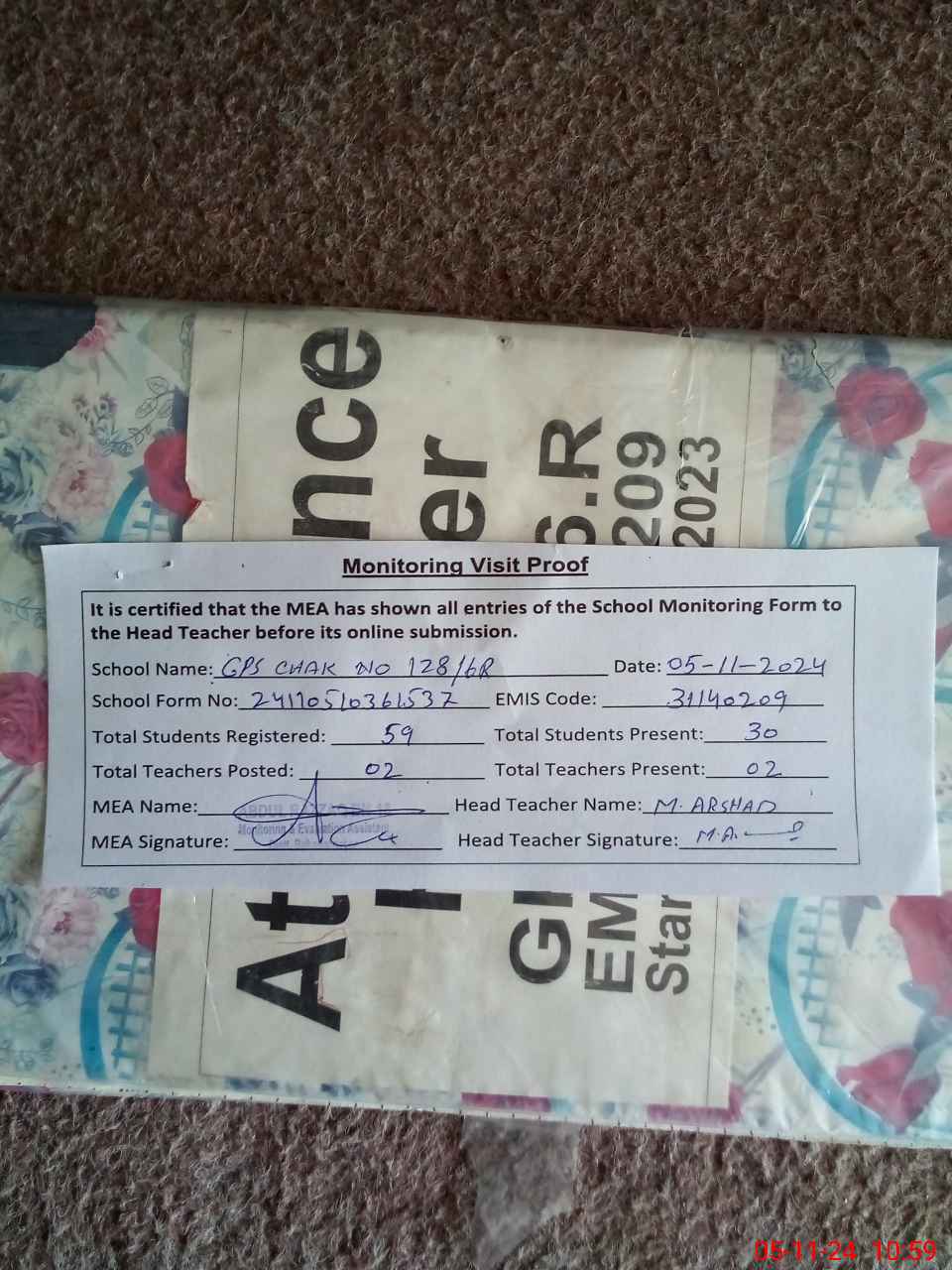 | Attendance Register | Head Teacher | MEA with School | Visit Proof |
