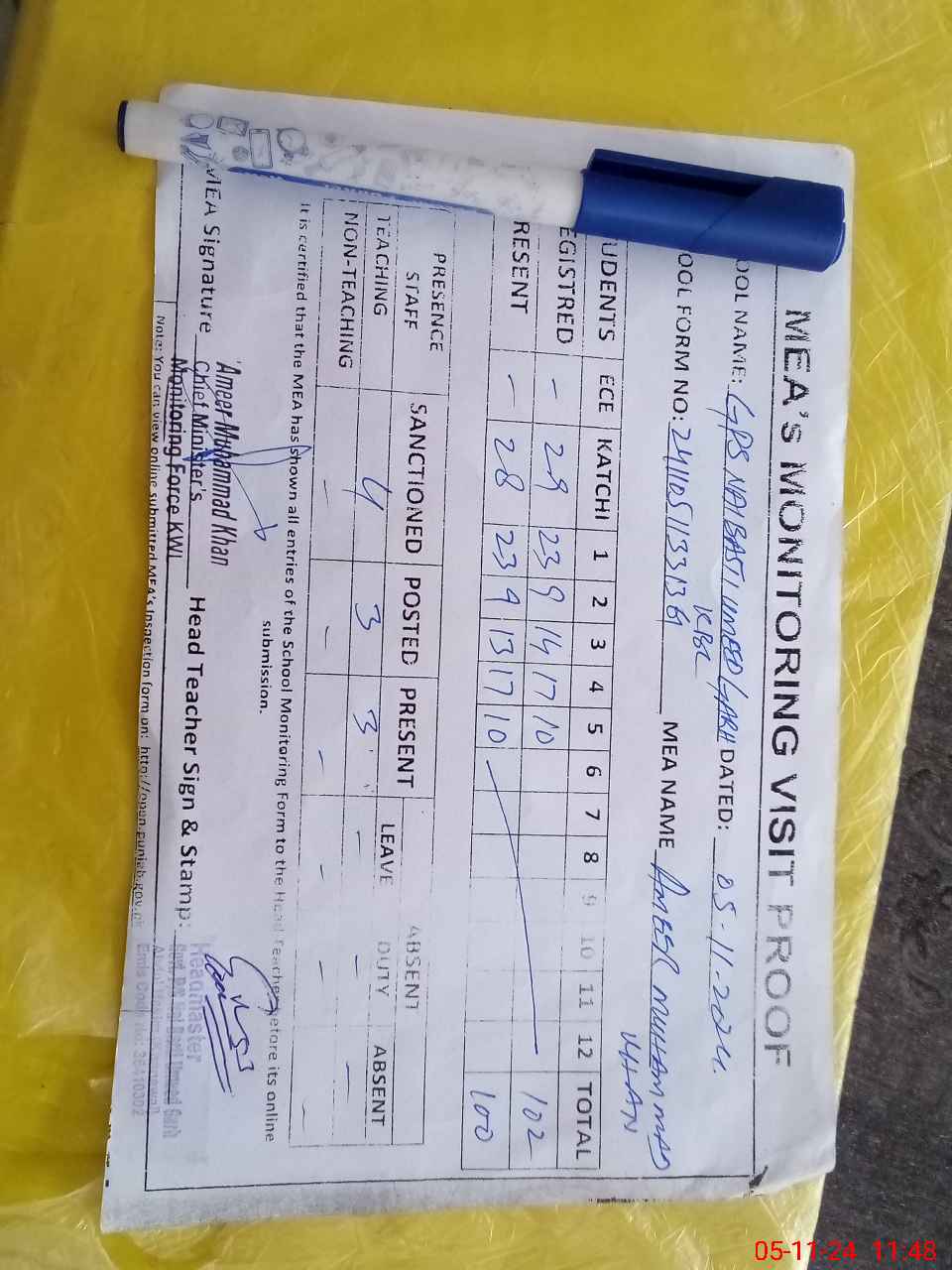| Remarks (Use Separate Page if Required): PMIU please update students attendance list on MEA tab all students shown in class three on slide has passed out from school and Please give access and update MEA school monitoring dashboard for follow up by MEA | |||||
