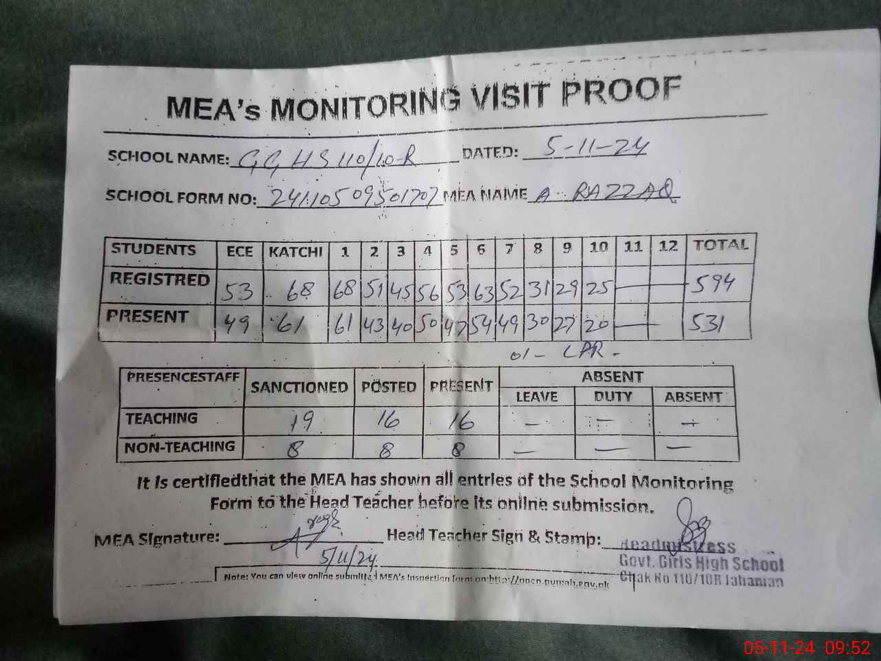| Attendance Register | Head Teacher | MEA with School | Visit Proof |
