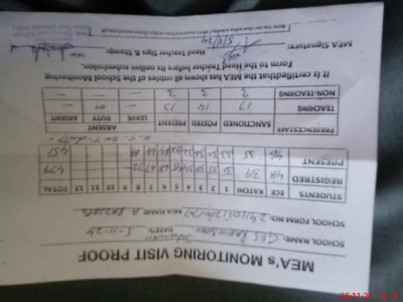 | Attendance Register | Head Teacher | MEA with School | Visit Proof |