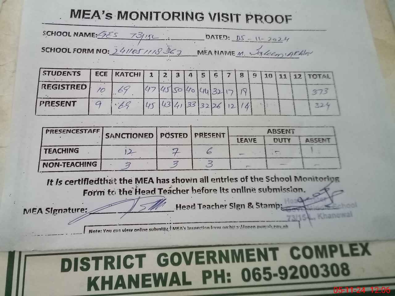 | Attendance Register | Head Teacher | MEA with School | Visit Proof |