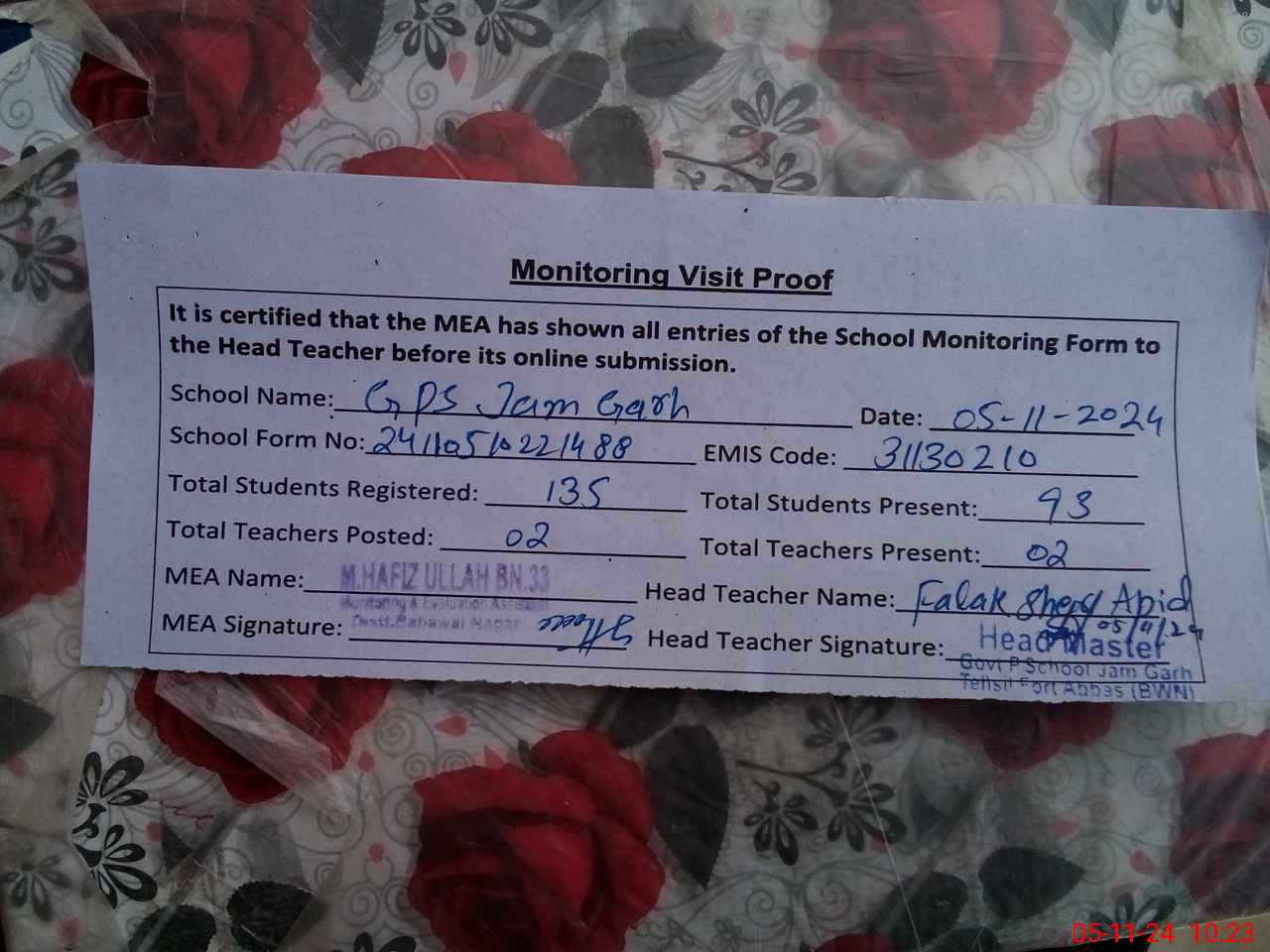 | Attendance Register | Head Teacher | MEA with School | Visit Proof |