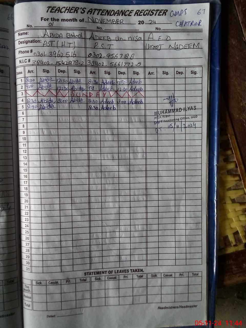 | CNIC | Full Name | Designation | R/C | Absence During Last Calender Month |