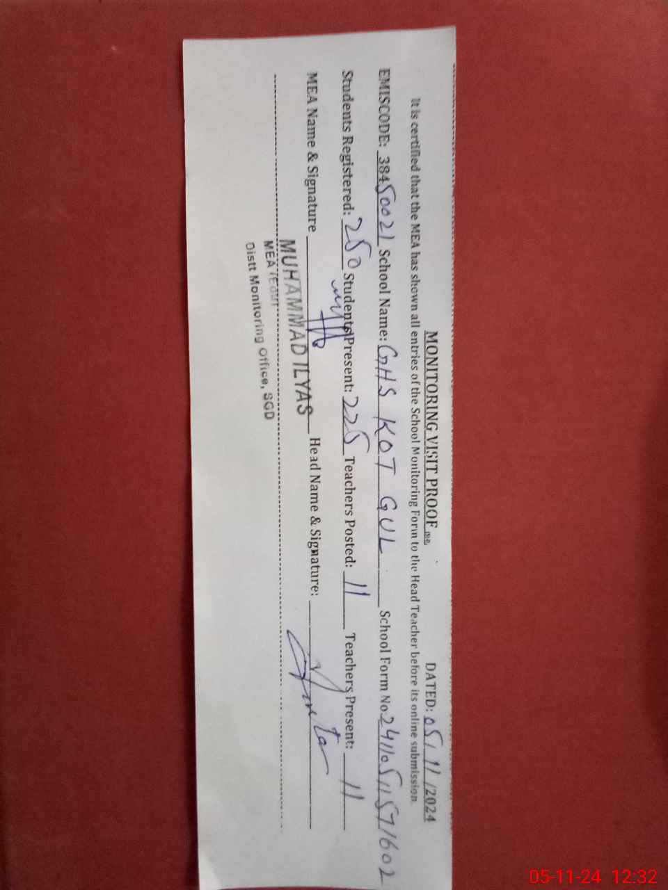 | EMIS Code: 38450021 | Name of School: GHS KOT GUL | |||