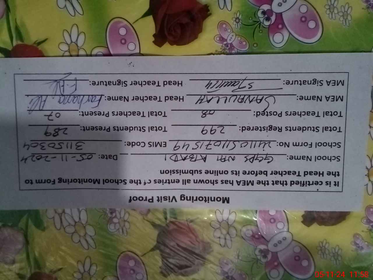 | Certified that this School was Inspected by the Undersigned MEA/DMO Today and the Information Stated Above is as Per Record. | |||||