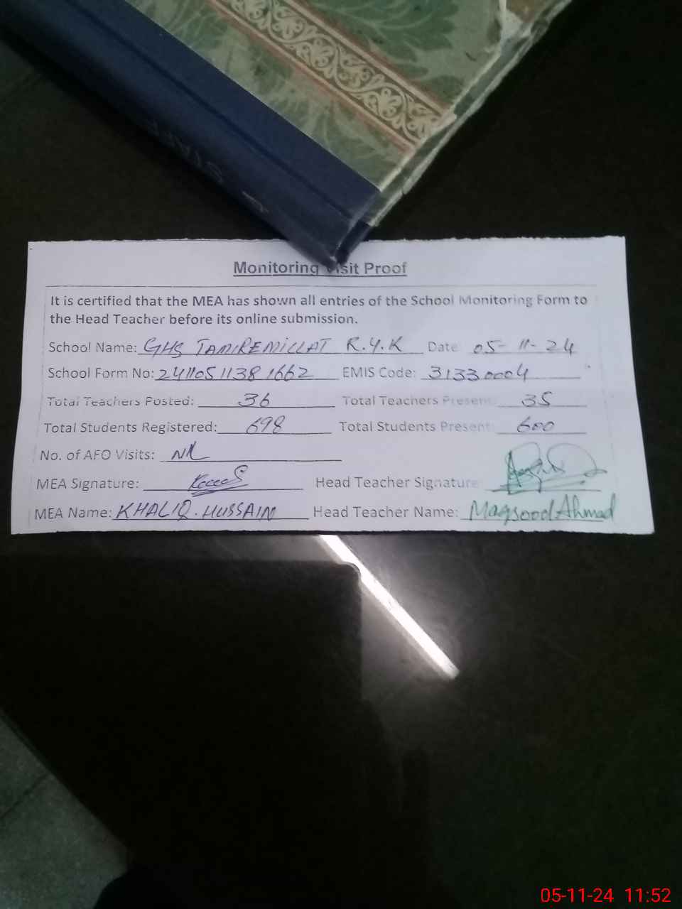 | Attendance Register | Head Teacher | MEA with School | Visit Proof |
