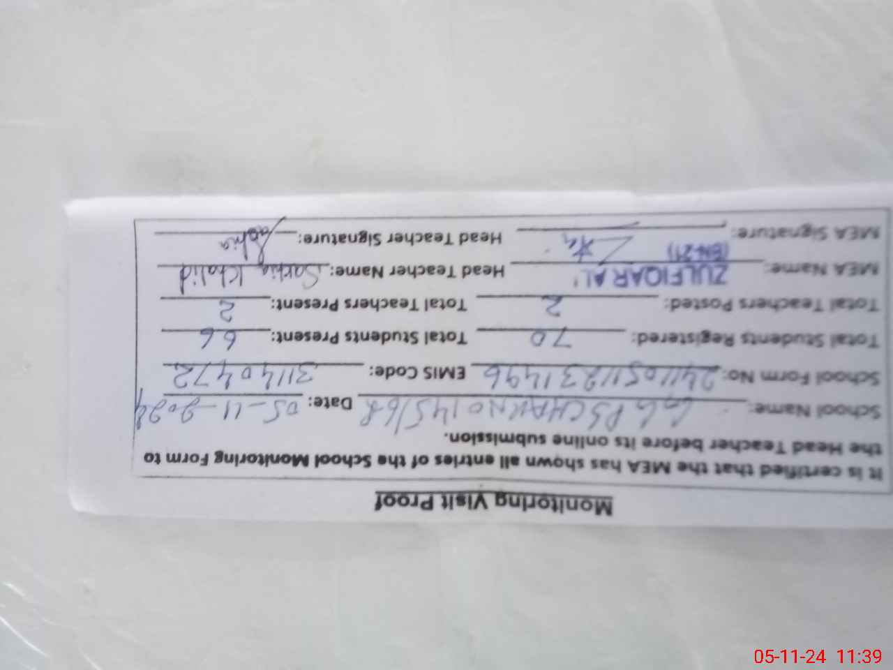 | Monitoring Date: 05-11-2024 | Start Time: 05-11-2024 11:23 AM | End Time: 05-11-2024 11:39 AM | Name of MEA: Zu**** Al**** BN**** | |
