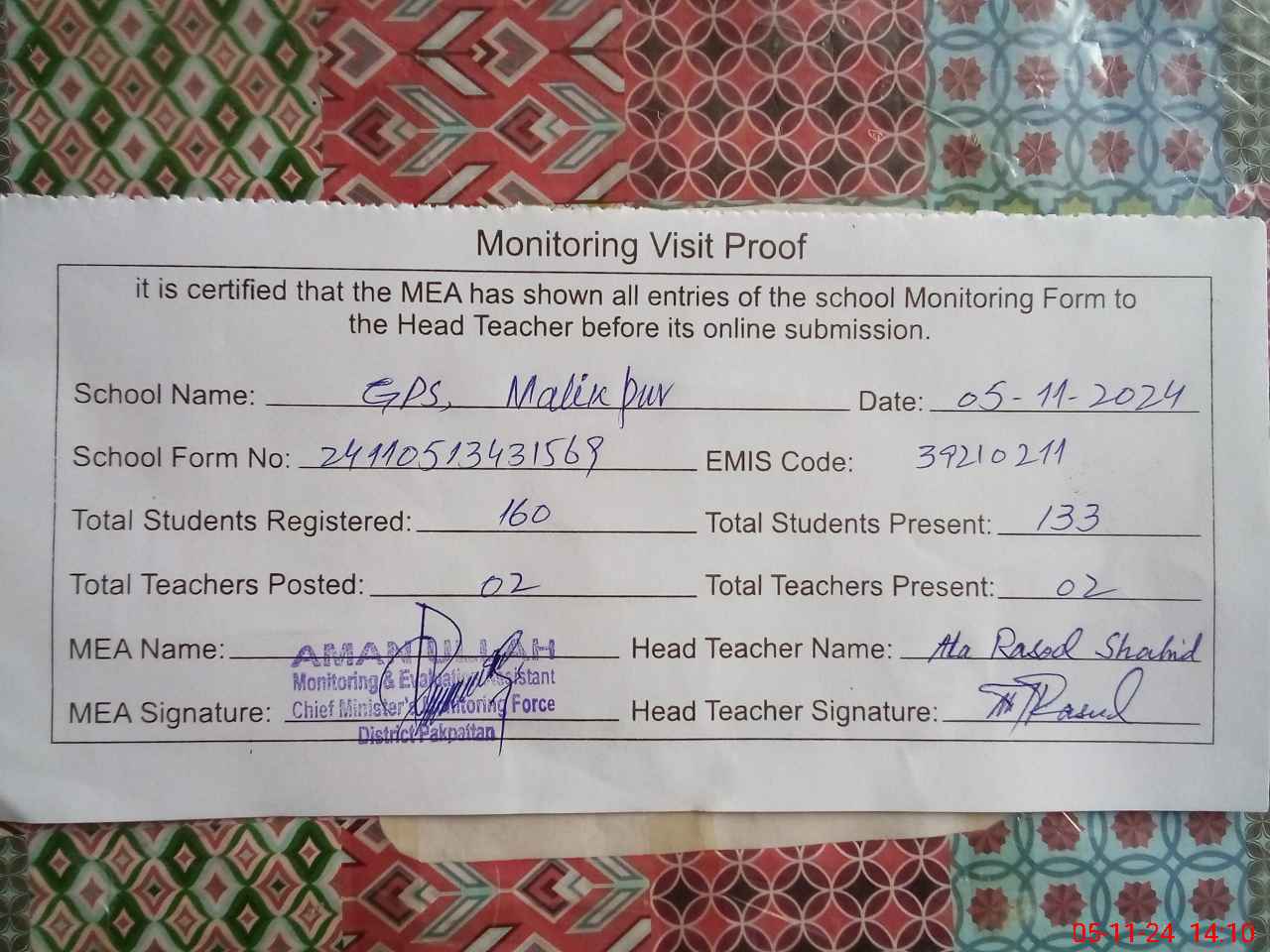 | EMIS Code: 39210211 | Name of School: GPS MALIK PUR PO PAKPATTAN | |||