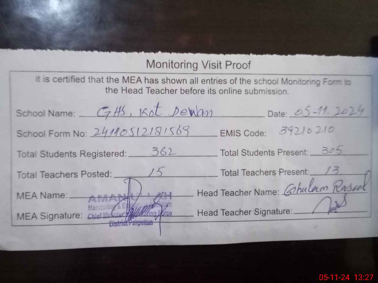 | EMIS Code: 39210210 | Name of School: GHS KOT DEWAN PO PAKPATTAN | |||