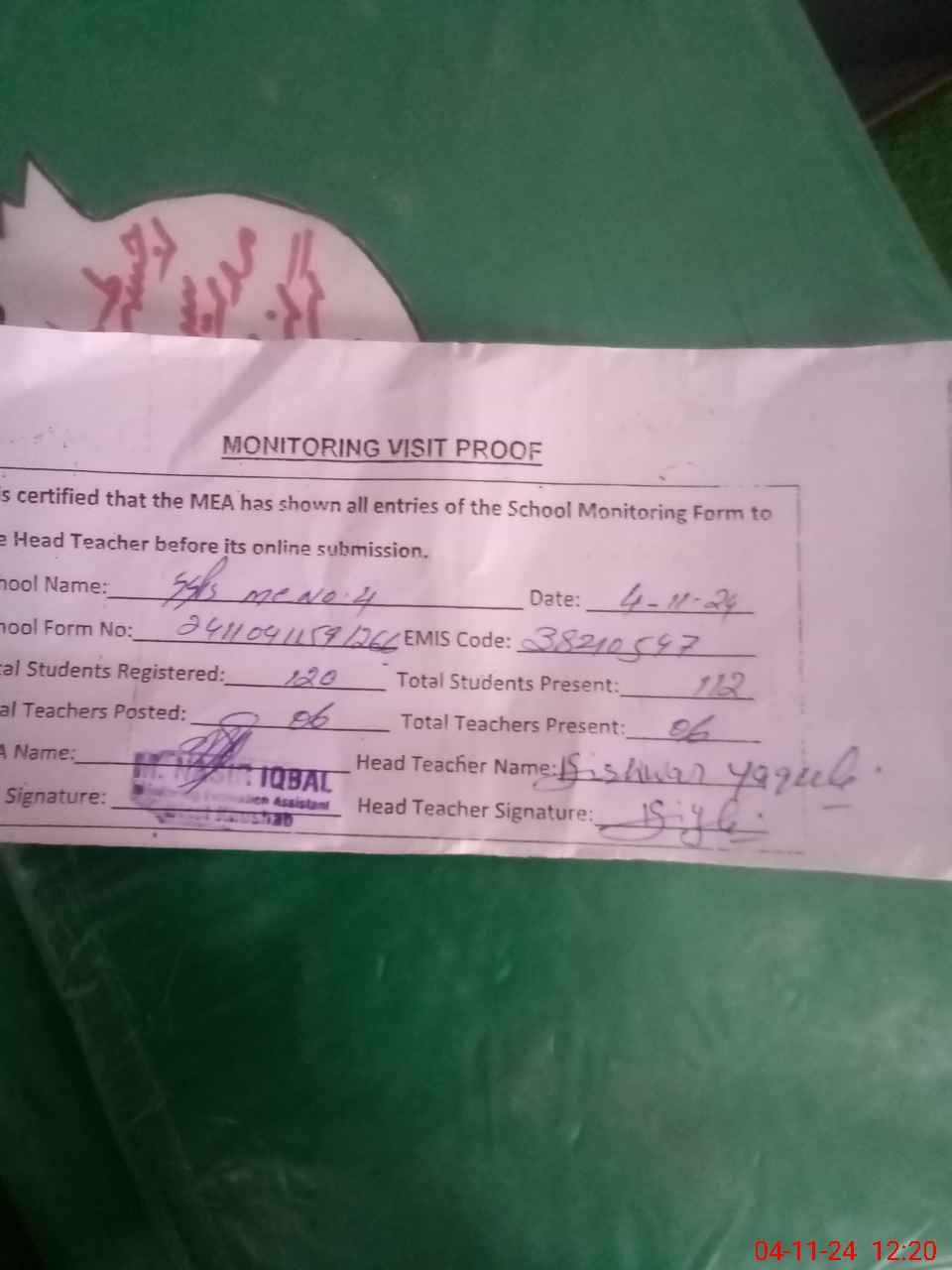 | Attendance Register | Head Teacher | MEA with School | Visit Proof |