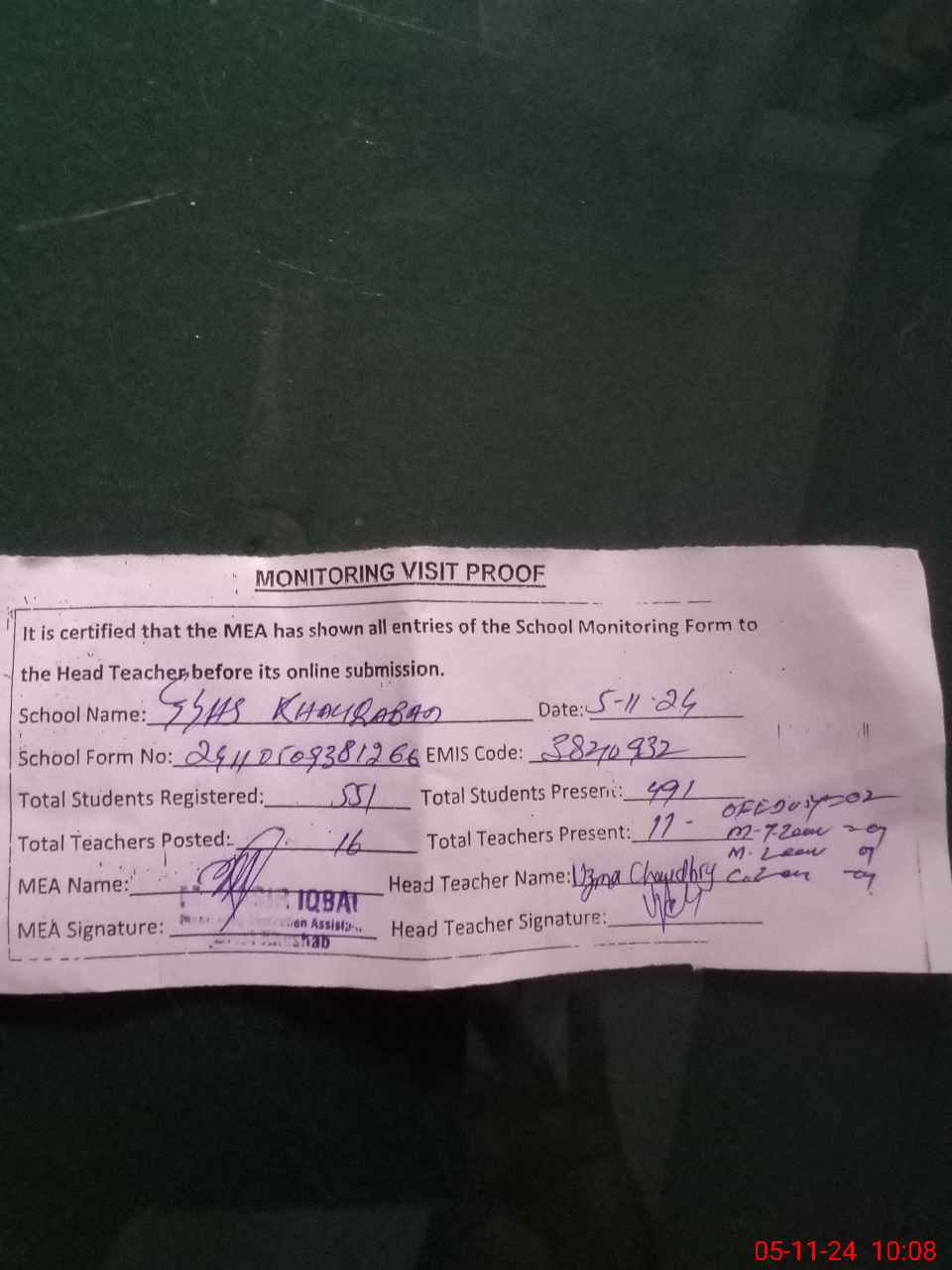 | Attendance Register | Head Teacher | MEA with School | Visit Proof |