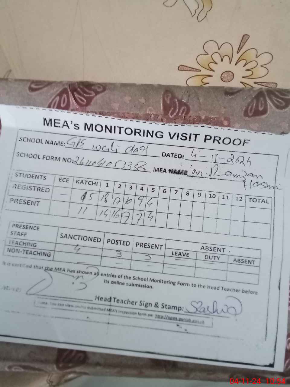 | Attendance Register | Head Teacher | MEA with School | Visit Proof |