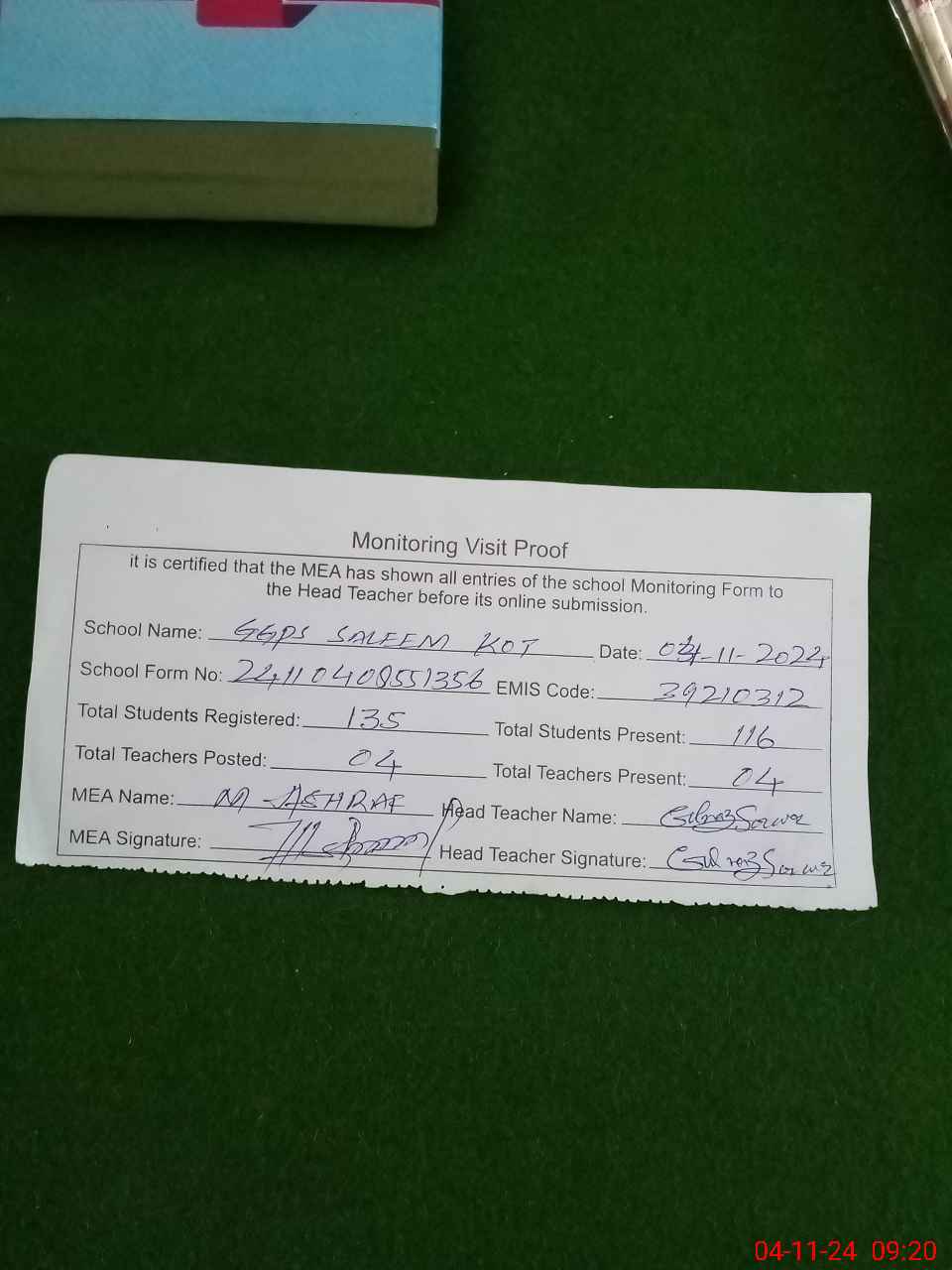 | EMIS Code: 39210312 | Name of School: GGPS SALEEM KOT | |||