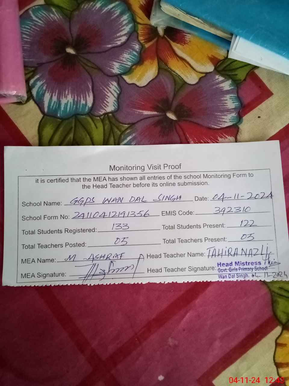 | Attendance Register | Head Teacher | MEA with School | Visit Proof |