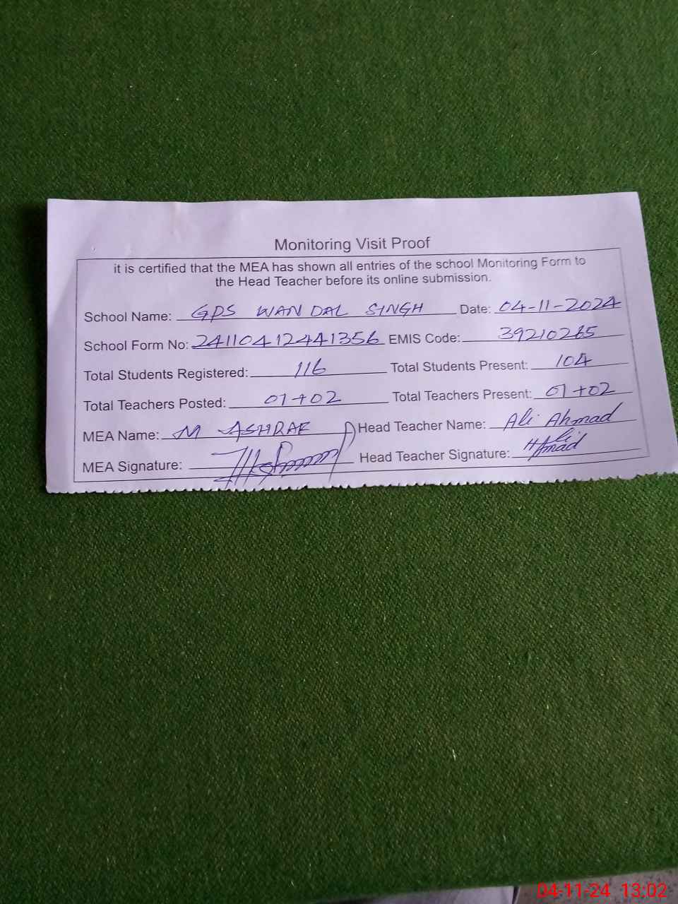 | Attendance Register | Head Teacher | MEA with School | Visit Proof |